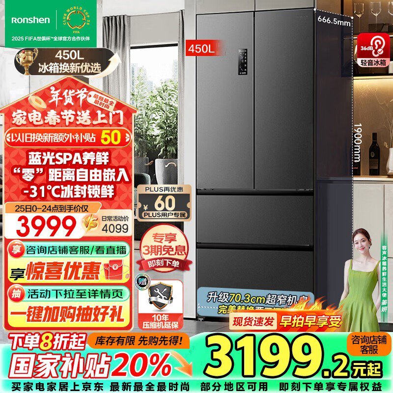 容声 BCD-450WD12MPLA 蓝光养鲜零嵌 多门冰箱 3136元
