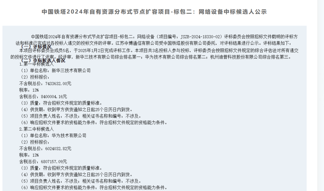 近日,中国铁塔2024年自有资源分布式节点扩容项目网络设备标包中选结果公布,华为、新华三等企业均参与投标,但最终华为不敌新华三,遗憾落标,到底是什么情况?