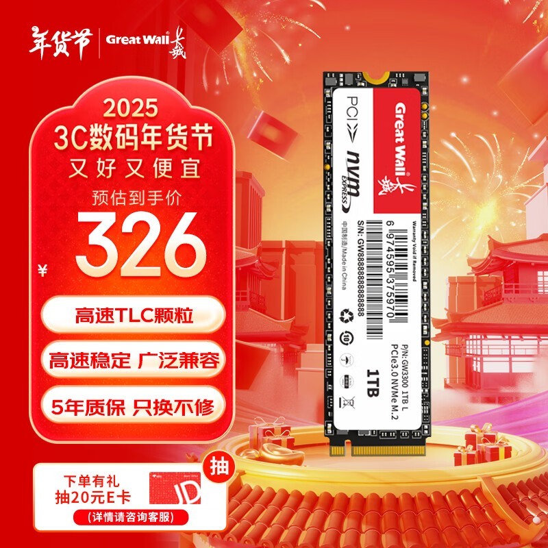 长城1TB SSD固态硬盘只要306元 限时优惠抢购中