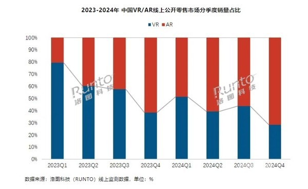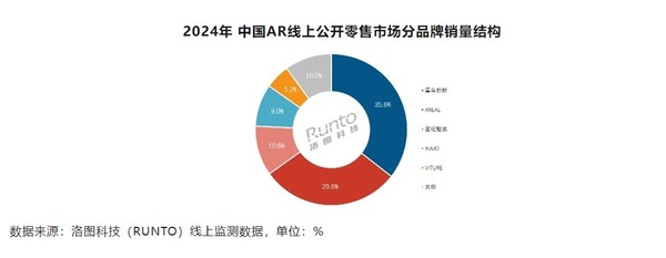 聚焦到中国市场,2024年中国XR设备市场在全渠道的销量为53.6万台,同比下降12.5%。其中,AR零售市场实现近30万台的销量和32.1%的同比增长。VR零售市场的规模继续下滑至26.9万台,同比降幅达34.4%。