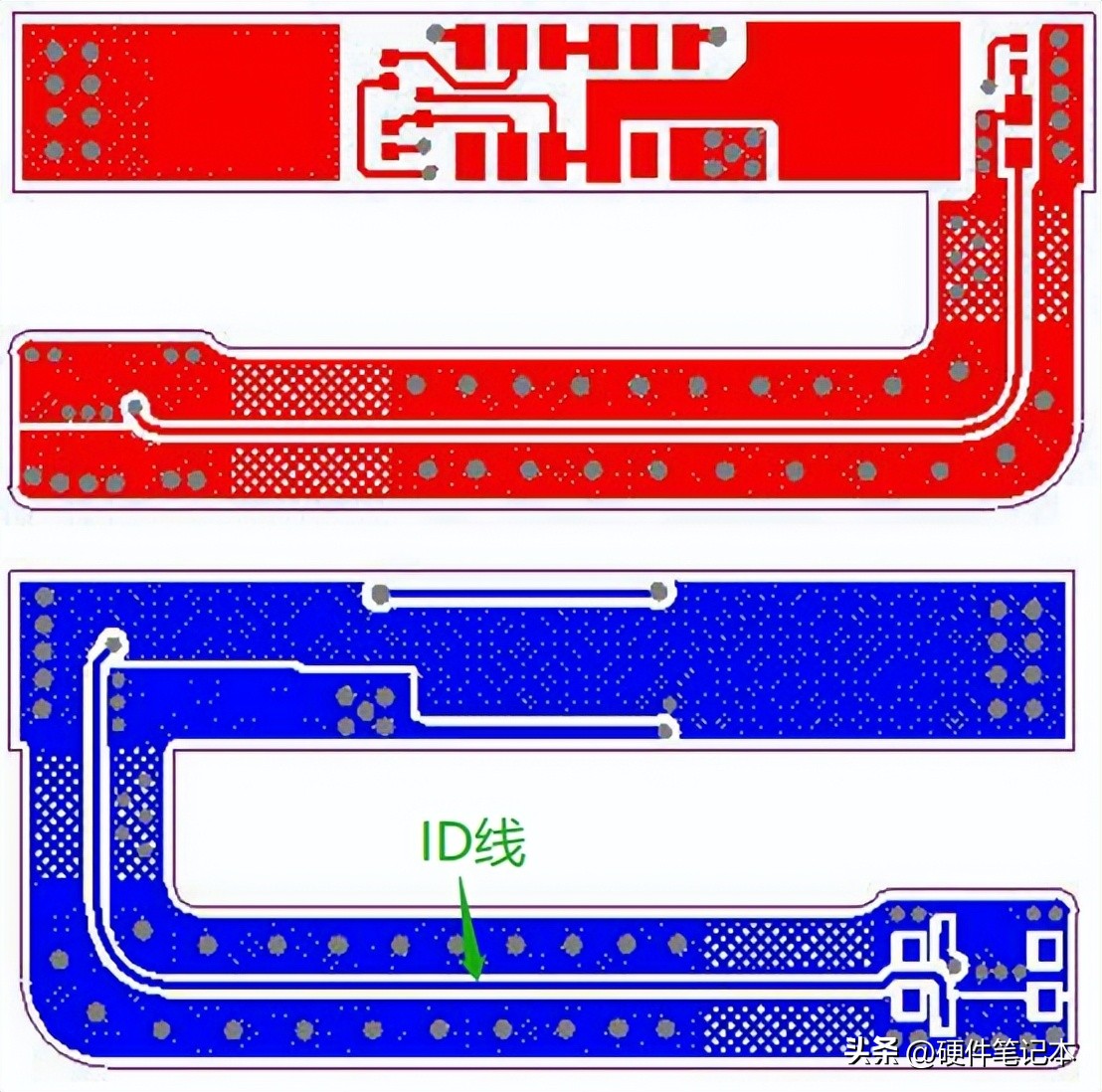 FPC改版成如下样式,ID和GND基本没有重叠区域,能量也不会耦合到ID管脚上,再也没有出现过关机问题。