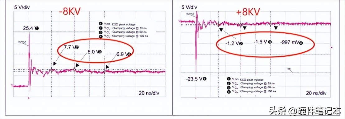 在图中GND上注入+8KV,没有问题,因为右边的TVS吸收了大部分能量,由于正向导通,钳位电压较低(小于4.4V),电池保护板没有触发保护机制。但是如果注入-8KV,TVS管开始反向钳位,瞬间的钳位电压较高(大于4.4V),超过电池起保护电压,电池触发保护机制,MOS管U2断开,导致关机。下图是TVS管的钳位特性,也能佐证这个结论。