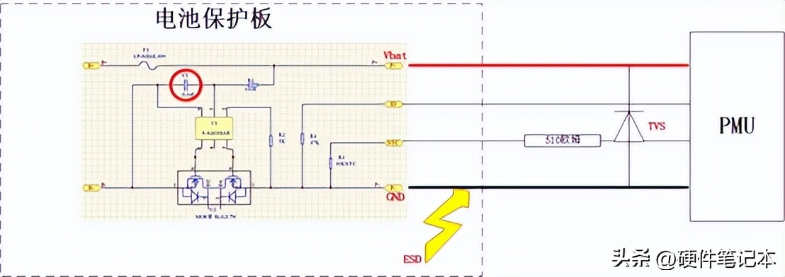 下面是这次电池保护板的走线,ID的走线与GND有较长的耦合长度,GND上的瞬间能量能很快耦合到这根线上,最终直接进入到PMU。