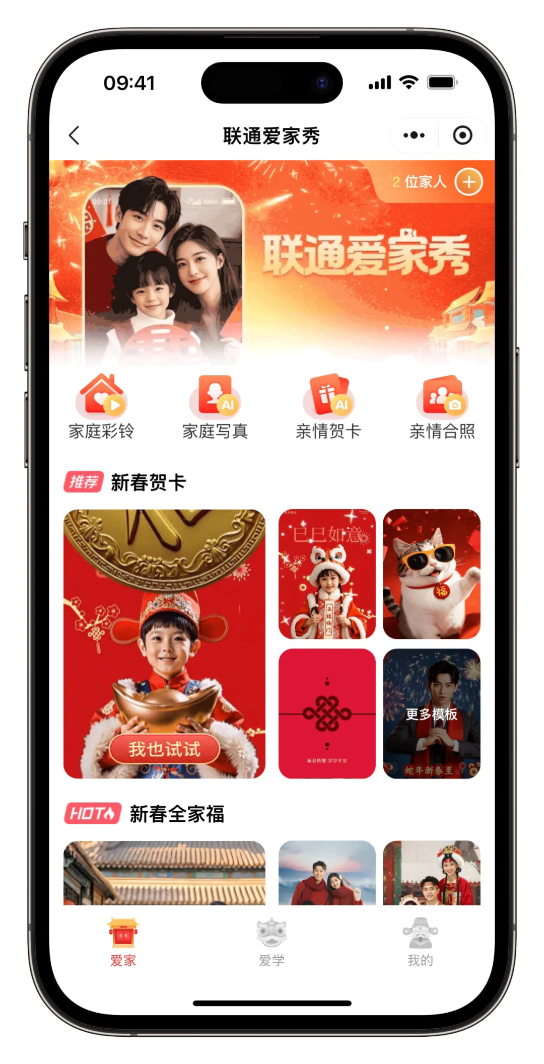 具体来看,作为一款面向家庭场景的细分应用,爱家秀以其四大核心功能,生动诠释了“爱家”这一核心理念,让家庭成员之间的联系更加紧密,让爱与祝福无处不在。一是AI亲情彩铃,让爱“近在咫尺”。作为爱家秀的特色功能。用户能够方便地建立一个家庭群组,并邀请家人的联通号码加入。之后,用户可以选择精选的彩铃内容,或者自己DIY个性化视频作为彩铃。只需一个人进行操作,就能为全家成员同时设置好视频彩铃。当电话打入时,独特的彩铃就会播放,无论是庆祝家人的生日、节日,还是表达日常的关怀,都可以通过家庭通信来实现,使得每一次来电都成为传递爱与祝福的温馨时刻。二是AI亲情写真(贺卡),AI全家福实现“云团圆”。亲情写真是爱家秀提供的另一项贴心服务。无论是年轻情侣的甜蜜合照,还是祖孙几代的温馨同框,爱家秀都能一键满足用户的需求。AI全家福功能,利用图像识别与合成技术,能够迅速生成高质量、多种风格的全家福照片。即使家人分散在不同地点,也能通过AI技术实现“云上团聚”。目前,该服务已支持单人写真、写真集、合照/全家福等多种照片类型,并提供了100多个图片模板供用户选择。春节期间,AI亲情写真还可以作为贺卡分享,共同贺岁,趣味十足。三是AI亲情V网,让爱与关怀跨越空间限制。亲情V网是爱家秀为家庭成员之间提供的无限免费通话服务。家庭群组成员之间可以实现无限免费通话,并设置三位短号快捷拨打。极大地降低了家庭成员之间的沟通成本,让爱与关怀能够跨越空间限制,随时传递。