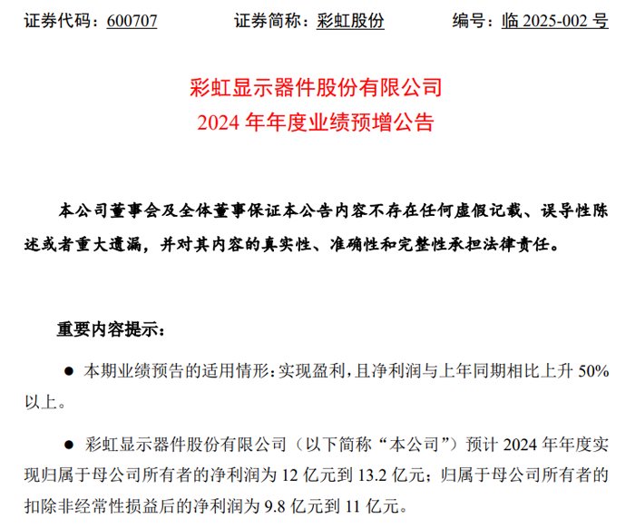 关于本期业绩预增的主要原因,彩虹股份表示:本报告期,液晶面板市场保持良性发展,技术创新和市场需求推动电视面板出货数量和面积持续稳定。公司顺应显示终端市场需求趋势,产品结构持续升级优化,大尺寸产能配置和品质可靠性稳定提升,降本增效不断深化,经营业绩稳健提升;公司加快推进G8.5+液晶基板玻璃产线建设、投产并稳定运行,本报告期基板玻璃产品产销量、销售收入同比保持持续增长。