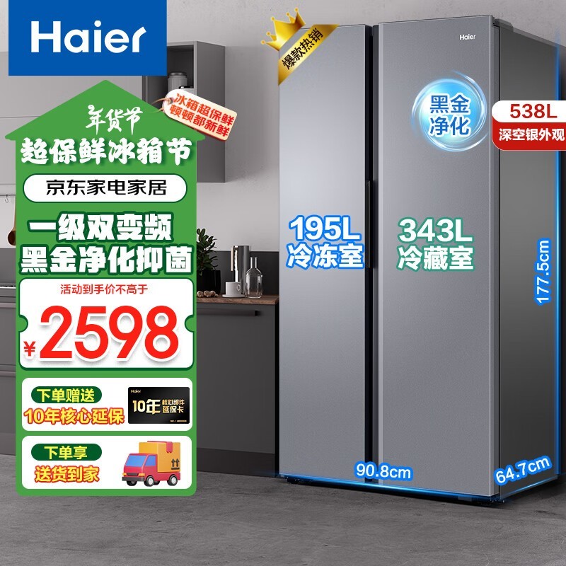 海尔Haier双开门538升超薄对开门冰箱优惠1918元