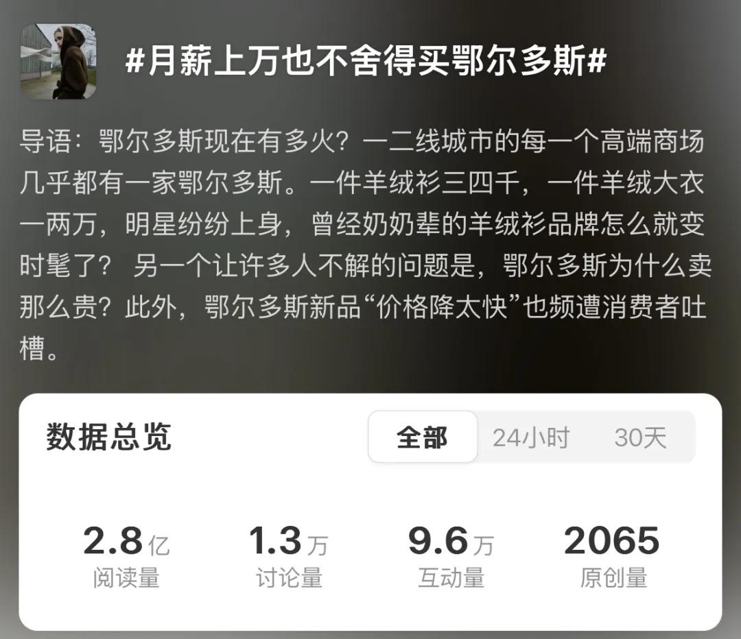 频繁被用来和香奈儿、miumiu作比较,让鄂尔多斯在年轻人心目中的地位越来越高了。
