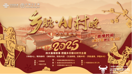 《乡脉·AI村晚》将由中国联通集团新闻宣传中心、联通在线信息科技有限公司、中国联通浙江省分公司联合出品,中国联通AIGC梦工场制作,于2025年1月27日19:00正式上线直播。