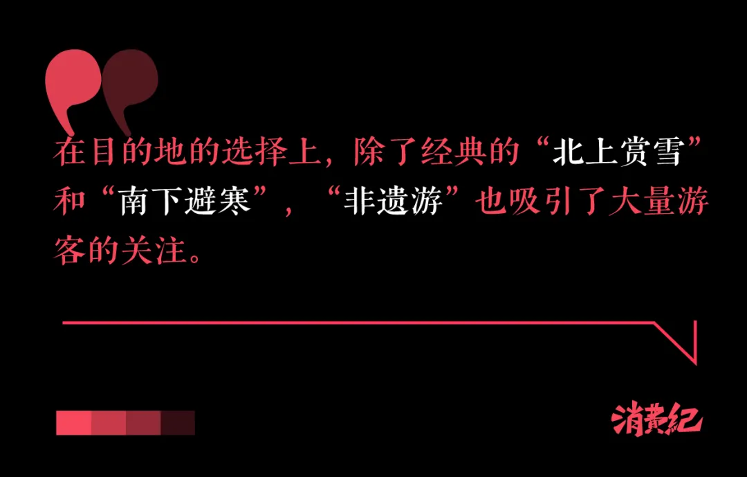 在目的地的选择上,除了经典的“北上赏雪”和“南下避寒”,“非遗游”也吸引了大量游客的关注。飞猪数据显示,截至目前,平台上包含非遗景点、非遗体验等内容的“非遗游”相关搜索热度环比上月增长133%。逛灯会、庙会、欣赏民俗歌舞表演、穿汉服旅拍等,成为春节期间备受青睐的体验项目。根据CBNData和阿里妈妈的数据,“非遗民俗”“非遗文创”的社媒互动量分别增长166%、81%。