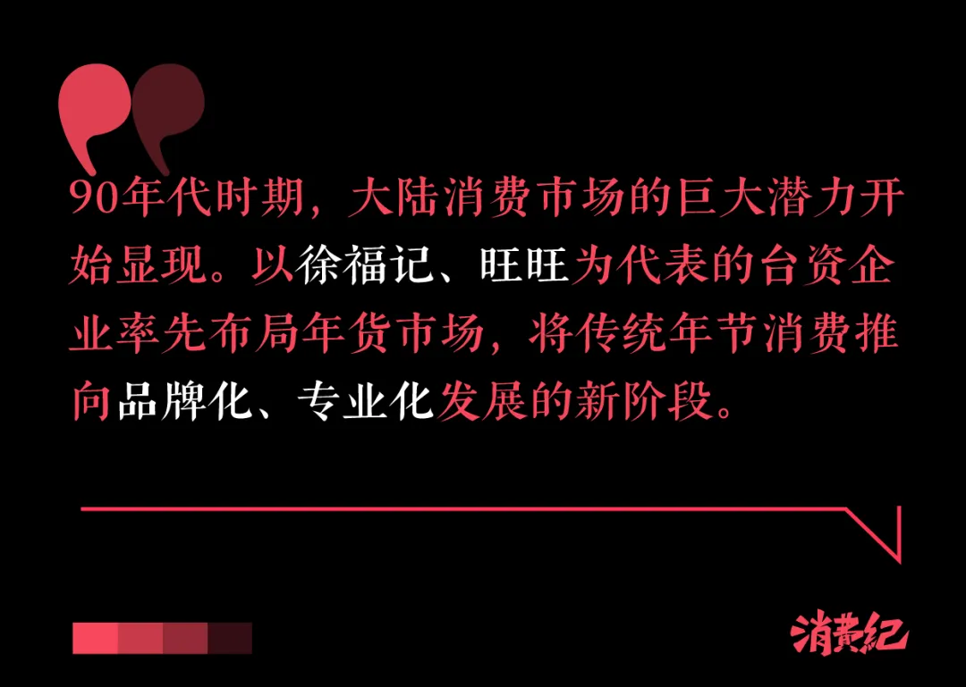 90年代时期,大陆消费市场的巨大潜力开始显现。以徐福记、旺旺为代表的台资企业敏锐把握了市场机遇,率先布局年货市场,将传统年节消费推向品牌化、专业化发展的新阶段。同时,可口可乐、大白兔等品牌凭借强大的营销攻势和品牌影响力,成功占据消费者心智,成为年货市场的"明星产品"。