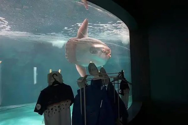 游客不是真人,脑袋是报纸打印后剪出来的,衣服是挂上去的,是工作人员的制服,它们排成一队,面朝翻车鱼,被固定在水箱外面。