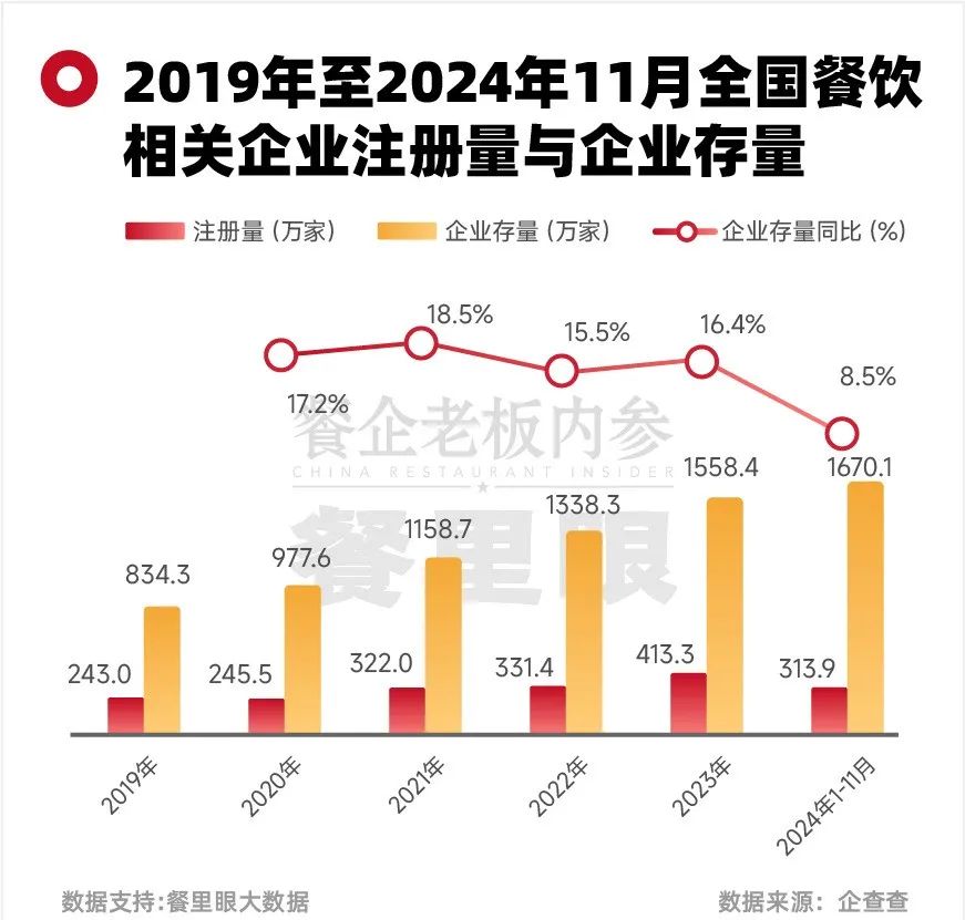 特别是2024年,餐饮的开店状态本就“井喷”。前11个月,根据相关数据统计,行业入局者已经超过了去年全年的总和——据企查查数据,2024年1-11月,全国餐饮相关企业注册量为313.9万家,企业存量达到了1670.1万家,已经超过了去年全年的1558.4万家,增长了8.5%。