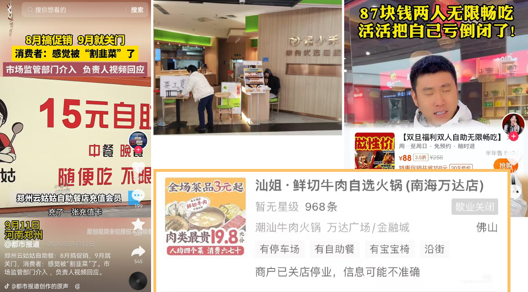 上海长宁区某25元畅吃的社区食堂天花板“邻里食堂”,突然闭店;宁波某东北小厨自助餐厅,开业仅5个月就闭店了,尽管该门店周围紧邻多个核心写字楼,汇聚了大量的上班族,依然难逃闭店魔咒;青岛素小禾素食自助三家门店全部停业,员工堵在门口要工资;河南郑州15元自助餐“云姑姑”被曝8月还在搞促销,9月就关门了……