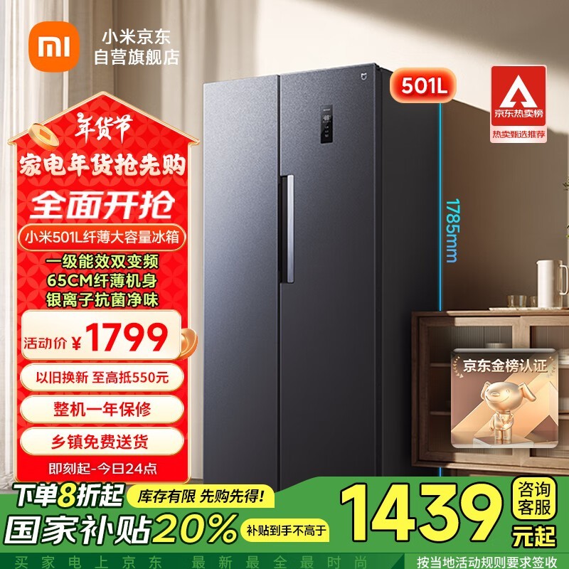 京东小米双开门冰箱优惠1439元,国补立减20%
