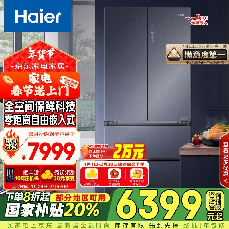 海尔553升全空间保鲜零距离自由嵌入法式四开门电冰箱,节能环保噪音小
