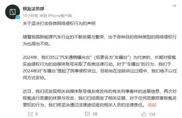 极氪法务部表示,2024年对以“汽车通病曝光台”(后更名为“车曝台”)为代表的,长期对极氪实施侵权行为的自媒体账号采取了各类法律行动。