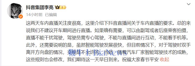抖音回应雷军、余承东直播间被封:平台不建议开车期间进行直播