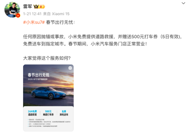 根据小米汽车发布的2025春节服务指南,1月22日至2月9日期间,小米汽车将提供24小时免费道路救援、500元打车券及异地送车服务。此外,春节期间小米汽车线上线下服务不打烊,门店还提供7x24小时上门补胎、到店免费充电等服务。