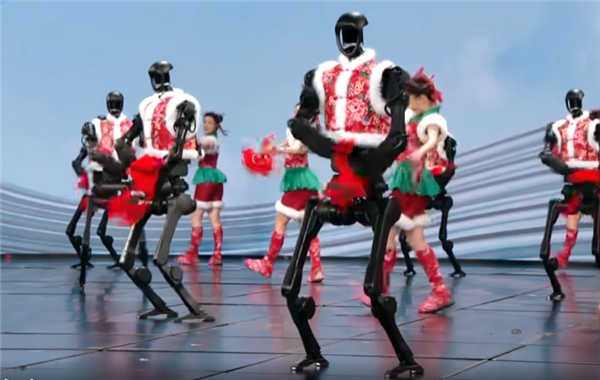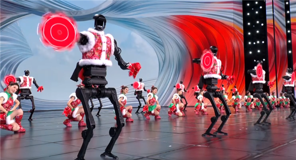 在节目中,宇树科技的多个人形机器人穿上红色大花袄,拿着手绢跳起了秧歌,实现极为柔顺的行走,还能和舞者完美配合互动,精准做出转手绢等复杂动作。