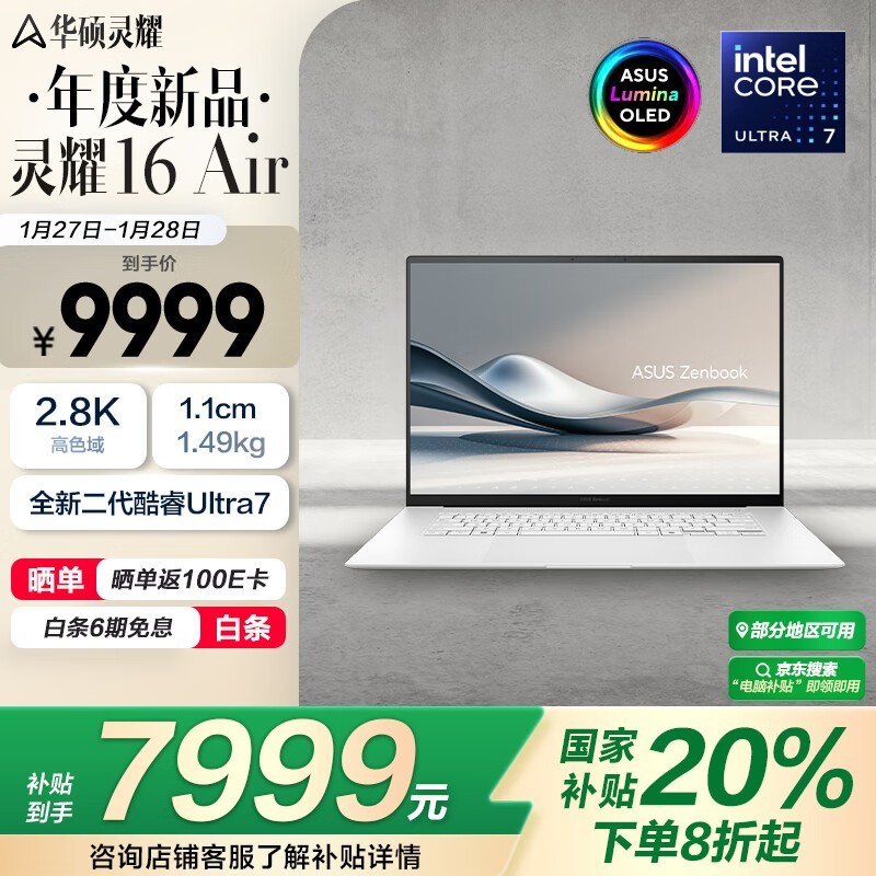 华硕ASUS灵耀16 Air 2025二代酷睿Ultra版轻薄本7943元