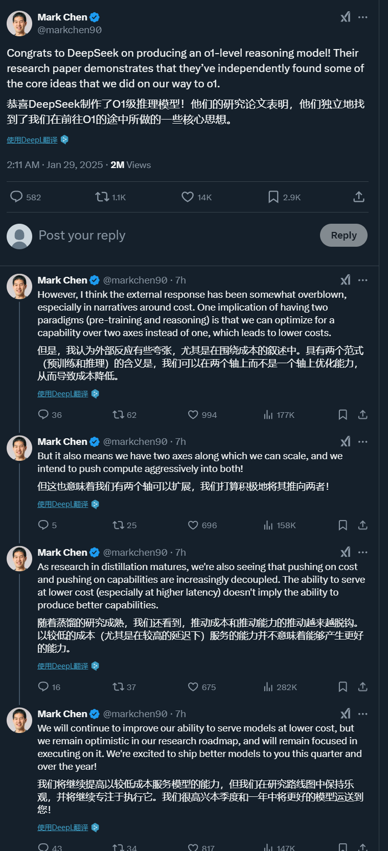 随后,OpenAI 首席研究官 Mark Chen 也发了帖。他表示,DeepSeek 确实独立发现了一些 OpenAI o1 也在用的核心理念,不过,这并不代表 OpenAI 在算力上的高投入是不合理的。