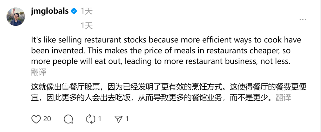 不少网友对 LeCun 的看法表示赞同,认为训练、推理成本更低的 AI 意味着这项技术能更快普及,从而创造更大的市场。