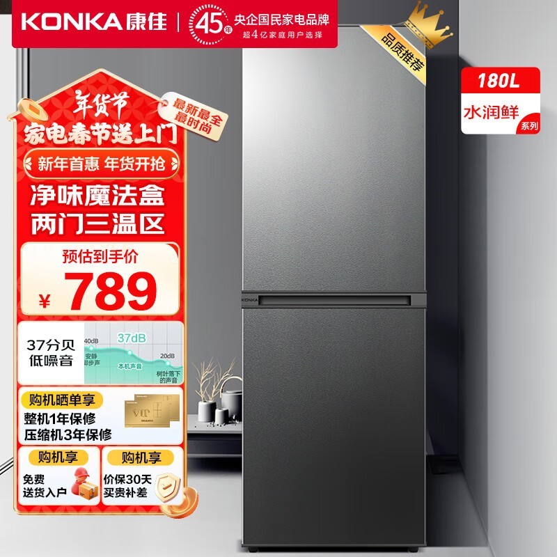 租房必备!康佳 BCD-180GY2S 直冷双门冰箱599元