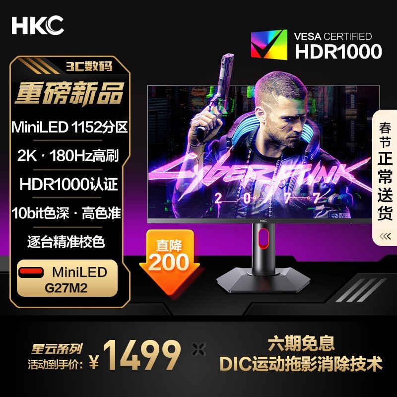 HKC G27M2显示器180Hz刷新率1ms响应时间 仅售1249元