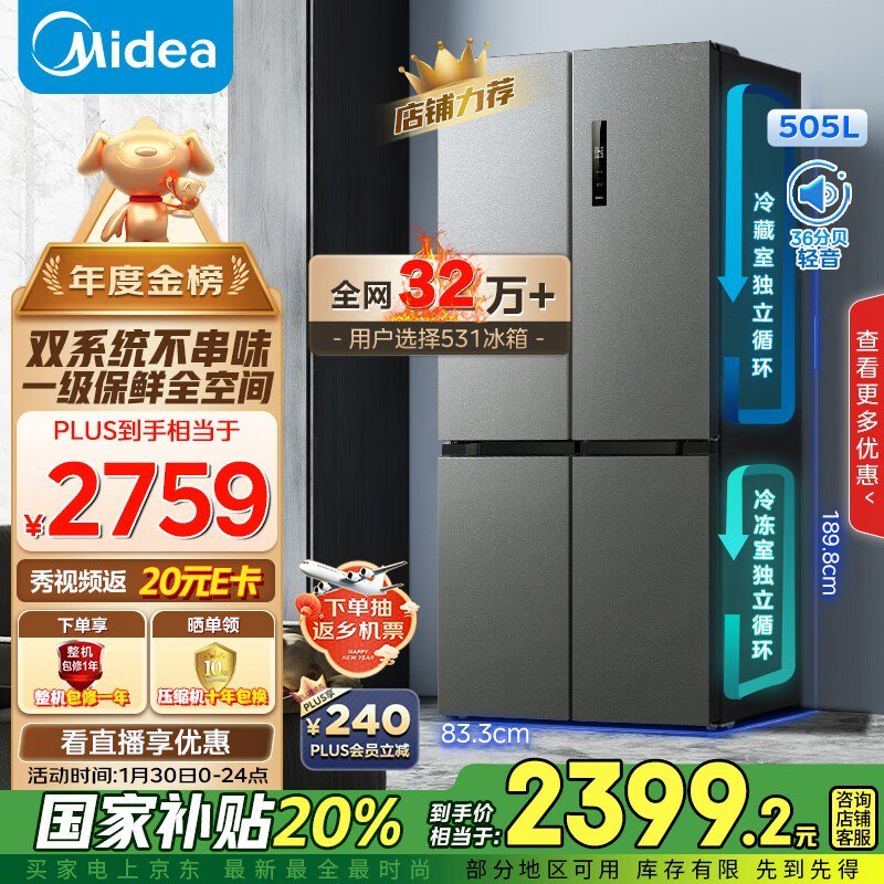 美的一级能效对开门冰箱2065元!