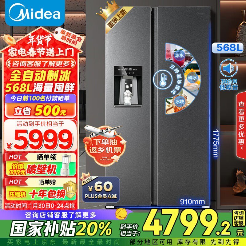 美的MR-596WKIPZE对开门冰箱,满减8折优惠4698元