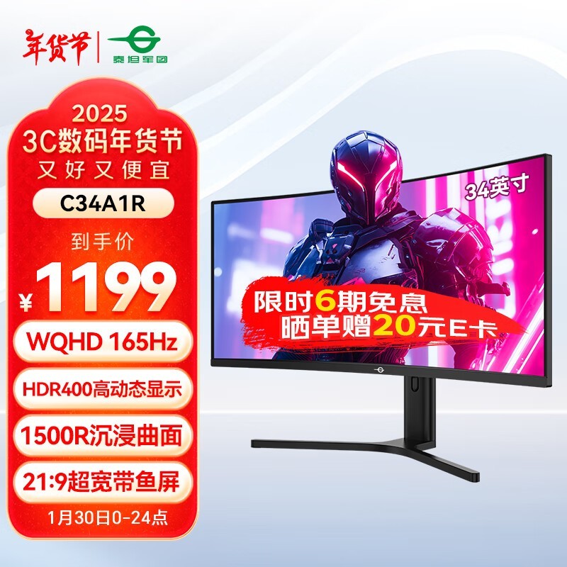 165Hz刷新率!泰坦军团C34A1R显示器仅售1199元