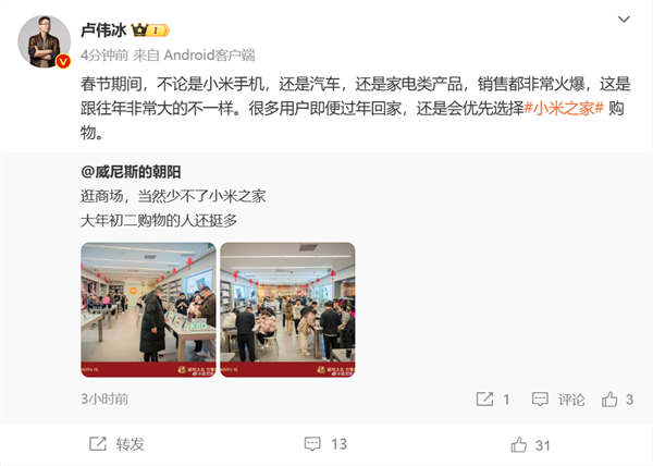 他欣喜地分享道:“春节期间,不论是小米手机,还是汽车,还是家电类产品,销售都非常火爆,这是跟往年非常大的不一样。很多用户即便过年回家,还是会优先选择小米之家购物。”