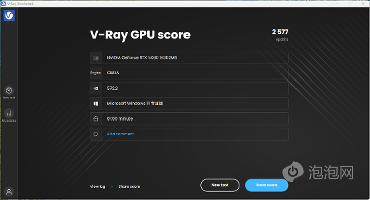 V-Ray的RTX测试上,索泰RTX 5080 AMP的得分为9378。