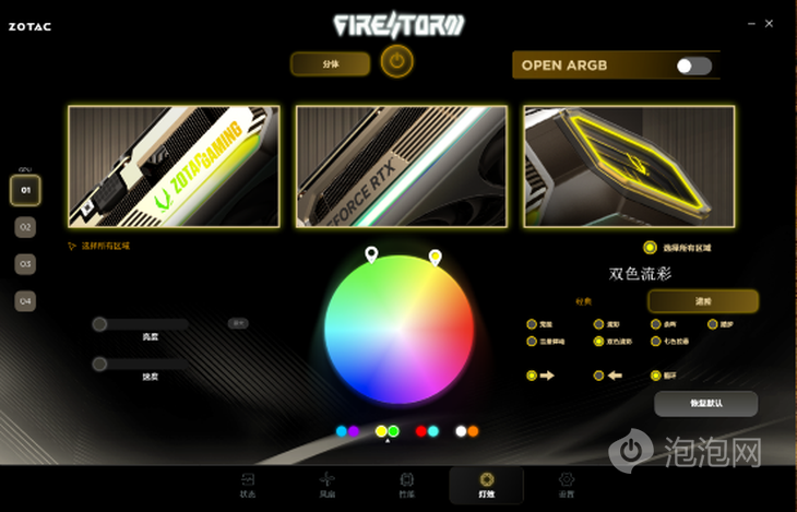 酷炫的灯光效果,还可以在索泰的FIRESTORM软件内调整显卡的灯光效果和颜色,有非常多的灯效可供玩家选择,带来更多的可能性,非常适合追求个性的用户选择。