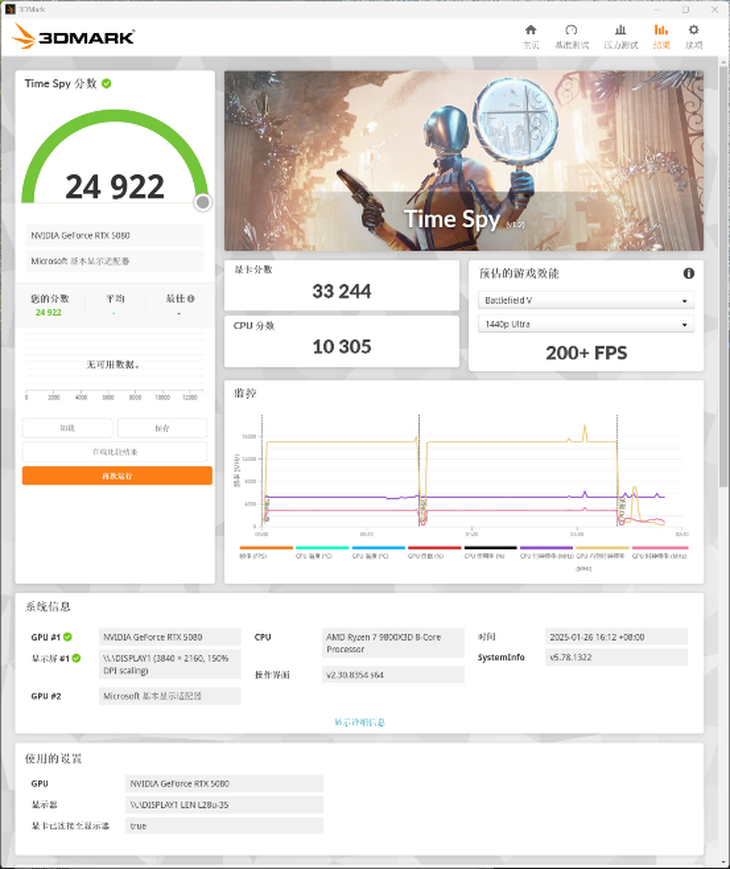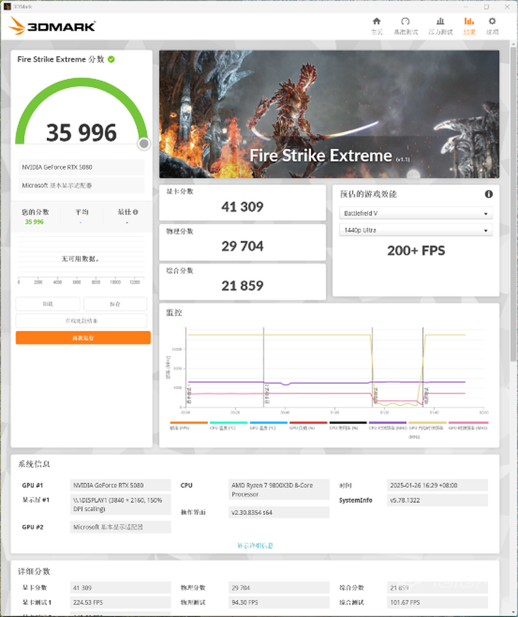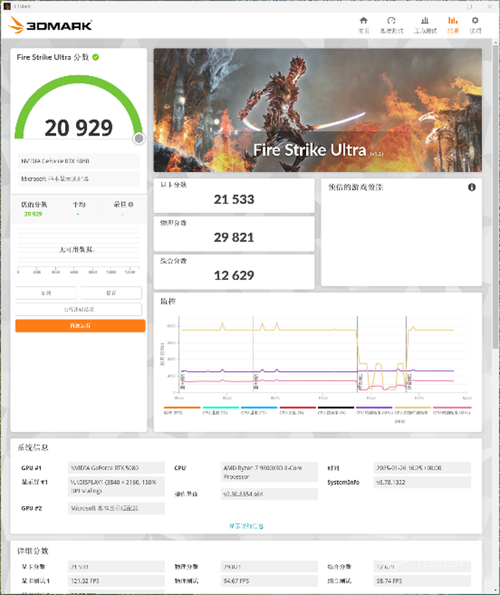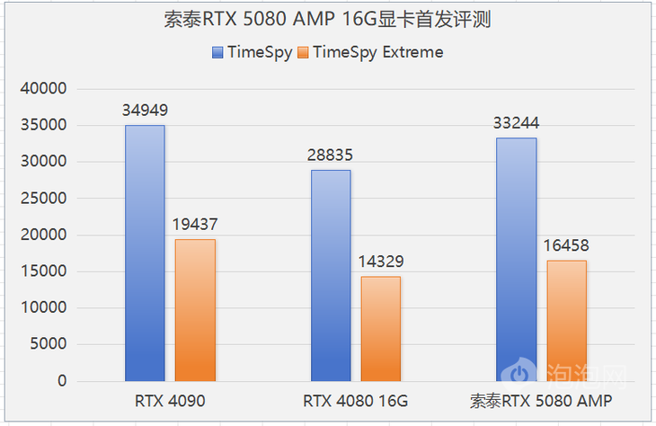 索泰RTX 5080 AMP的DX12跑分上,可以看到,显卡的性能表现非常不错,尤其是是Timespy测试上,基本上和RTX 4090在同一水平上,并且大幅领先上代RTX 4080,性能表现出色。