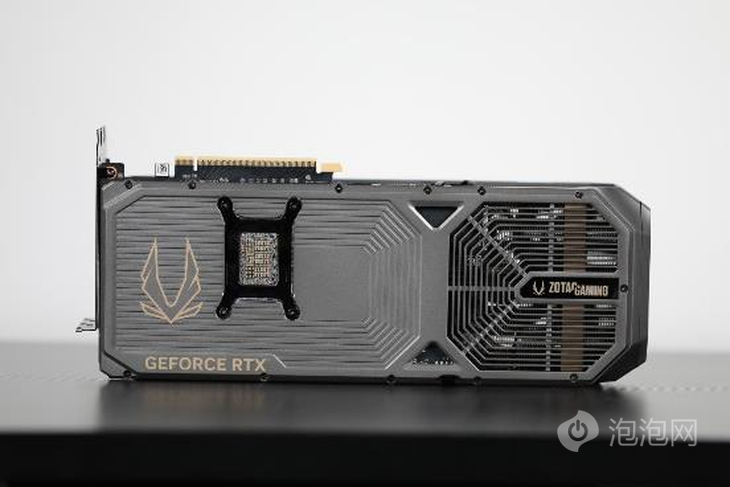 显卡的背面采用了整块的合金背板设计,回旋的纹路设计,让显卡背面的看上去不再单调,配合上两个三角形的点缀和尾部的镂空设计,让整块显卡保证坚固持续的同时,让整卡的外观更加经典耐看。