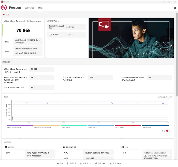 Ul Procyon测试中,我们测试了GPU加速的视频编辑模式跑分,在这个模式下得分如上图所示,达到70865,分数非常不错,能够胜任各种类型的PR视频剪辑,帮助内容创作者获得更好的视频处理能力。