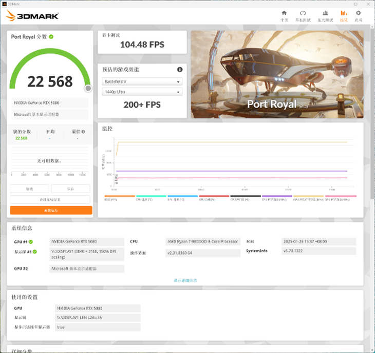 3DMARK的Port Royal光追性能跑分为22568,表现非常不错,能够高清运行各类光追游戏,让玩家获得更加身临其境的画面。