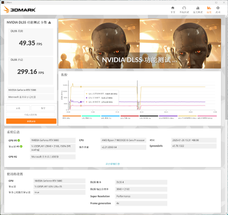 DLSS 4专项测试中,可以看到在4倍帧生成的条件下,游戏帧数从49.35提升到了299.16,帧数提升了600%,性能提升非常巨大,建议大家玩游戏的时候一定要开启DLSS,获取更高的游戏帧数。