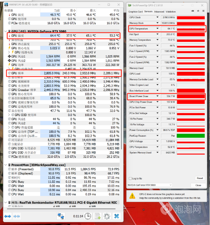 我们使用3DMARK的Speed Way进行压力测试来作为显卡的功耗测试,通过上面可以看到,烤机10分钟的情况下,显卡的温度为64℃左右,显卡的功耗为360W左右,散热和功耗释放非常好。