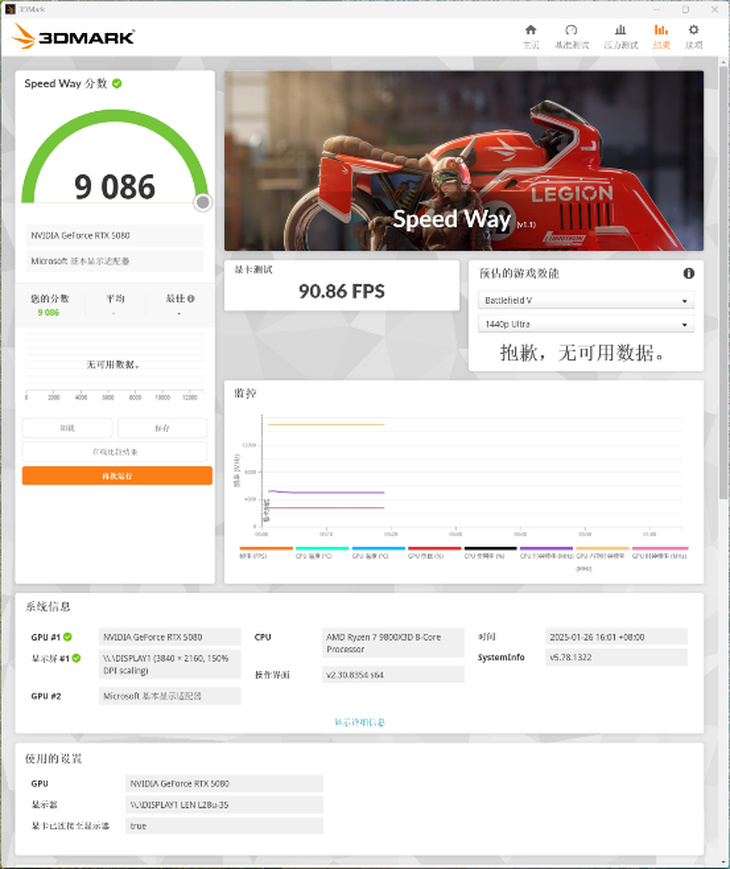 Speed Way跑分上,显卡的帧数为90.86,分数达到9086,非常棒。