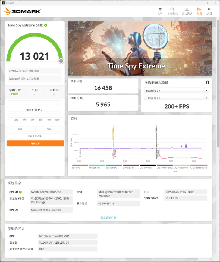 可以看到成绩如上图所示,相对于上代的RTX 4080,索泰RTX 5080 AMP的成绩领先幅度超过20%,性能表现非常给力。