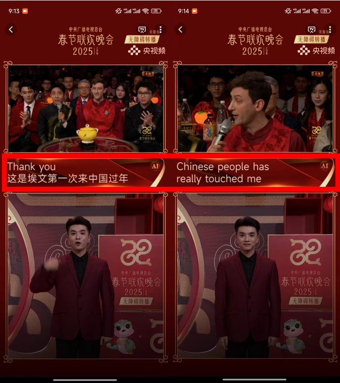 (图:央视频无障碍转播实时字幕)不用等初一早上,听障者除夕夜也能一起共鸣团聚时刻