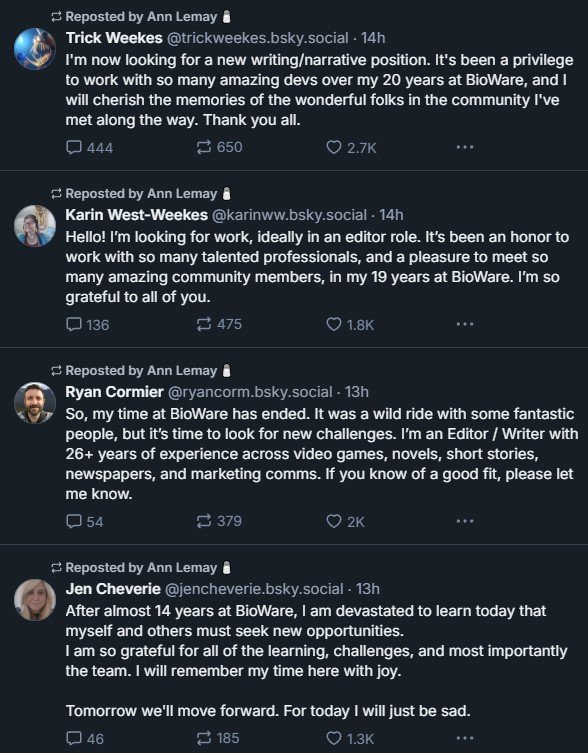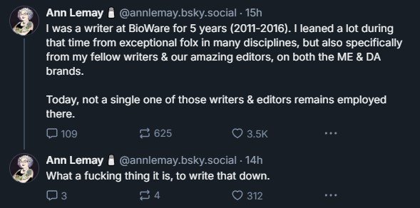 EA正在清理门户,《质量效应5》交由另一批人掌控,所有资深编剧及写手要么离开了BioWare,要么被调往其它单位。曾于2011至2016年间在BioWare任编剧的Ann Lemay在社交平台发帖称,她所认识的编剧都不在了,全都离开了BioWare: