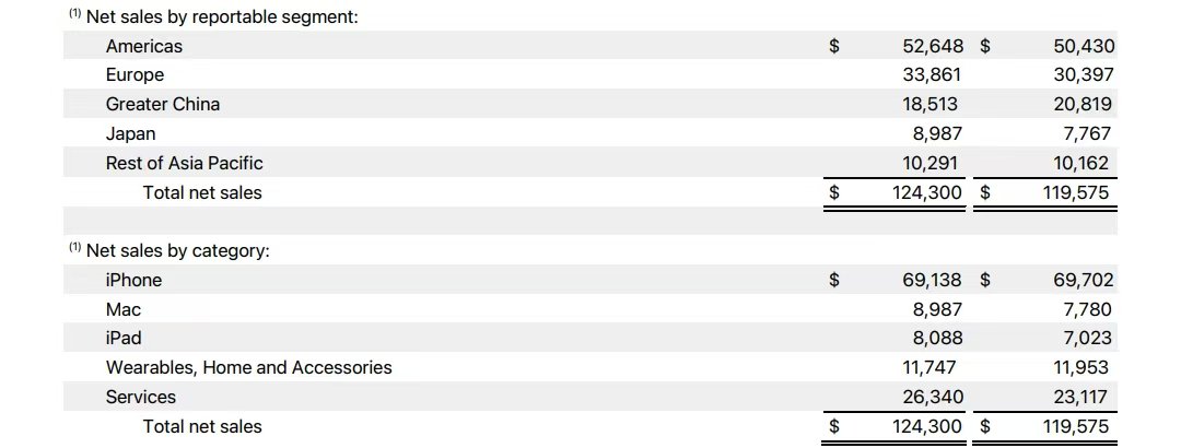 该季度苹果iPad、Mac收入同比增加,iPhone以及可穿戴设备、家居与配件收入同比下降。其中iPhone产品线收入691.4亿美元,同比下降了0.8%;iPad产品线收入80.9亿美元,同比增长了15.2%;Mac产品线收入89.9亿美元,同比增长15.6%;可穿戴设备、家居与配件产品线收入117.5亿美元,同比下降了1.7%;服务业务收入263.4亿美元,同比增长了13.9%。