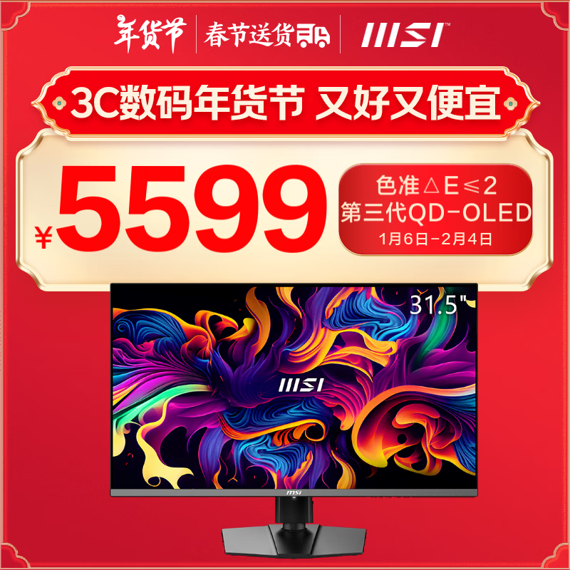 微星 31.5英寸 4K 量子点 OLED 240Hz 显示器仅售5599元