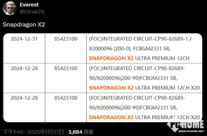 高通目前已经开始了下一代骁龙X2系列处理器的研发,新产品现身海关发货清单。