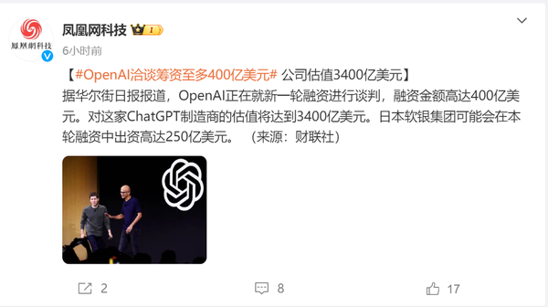 消息称OpenAI新一轮融资目标400亿美元 估值有望翻倍