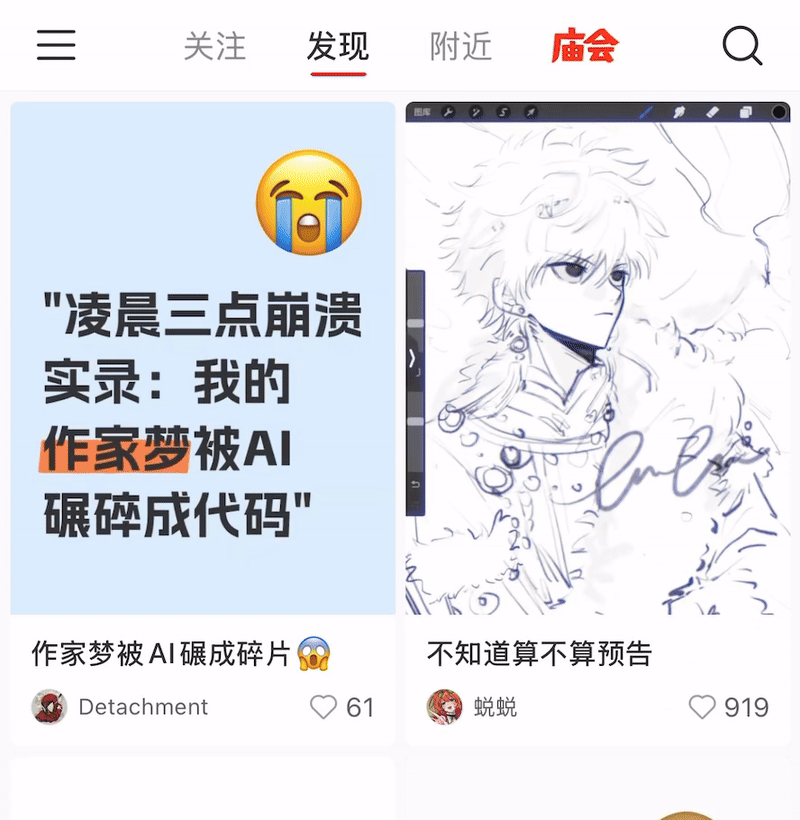 但是我不爱用小红书的算法推荐,我甚至不欣赏它的入口设置。点进小红书之后,先出来的页面是「发现」,也就是算法推荐的内容,一旁的「关注」需要手动选择,哪怕是在「关注」栏,信息也不完全按照时间线排列。这仿佛在暗暗地告诉我们,遵从于推荐算法识别出的、你可能会喜欢的内容吧。