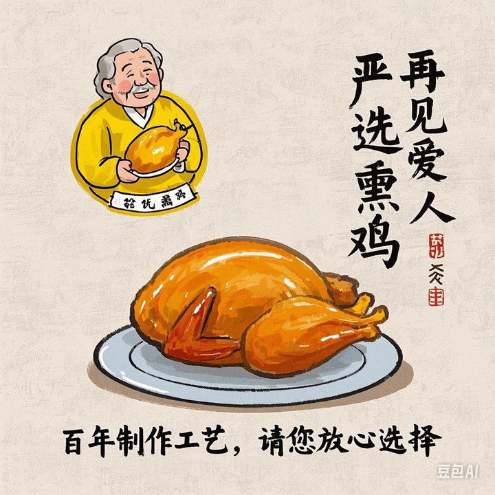 我常用的一个套路是,把某个 AI 产品更新的功能,套在最新的热点里,比如,为了体现豆包文生图可以直出中文字,我使用了当时很火的《再见爱人》熏鸡梗。